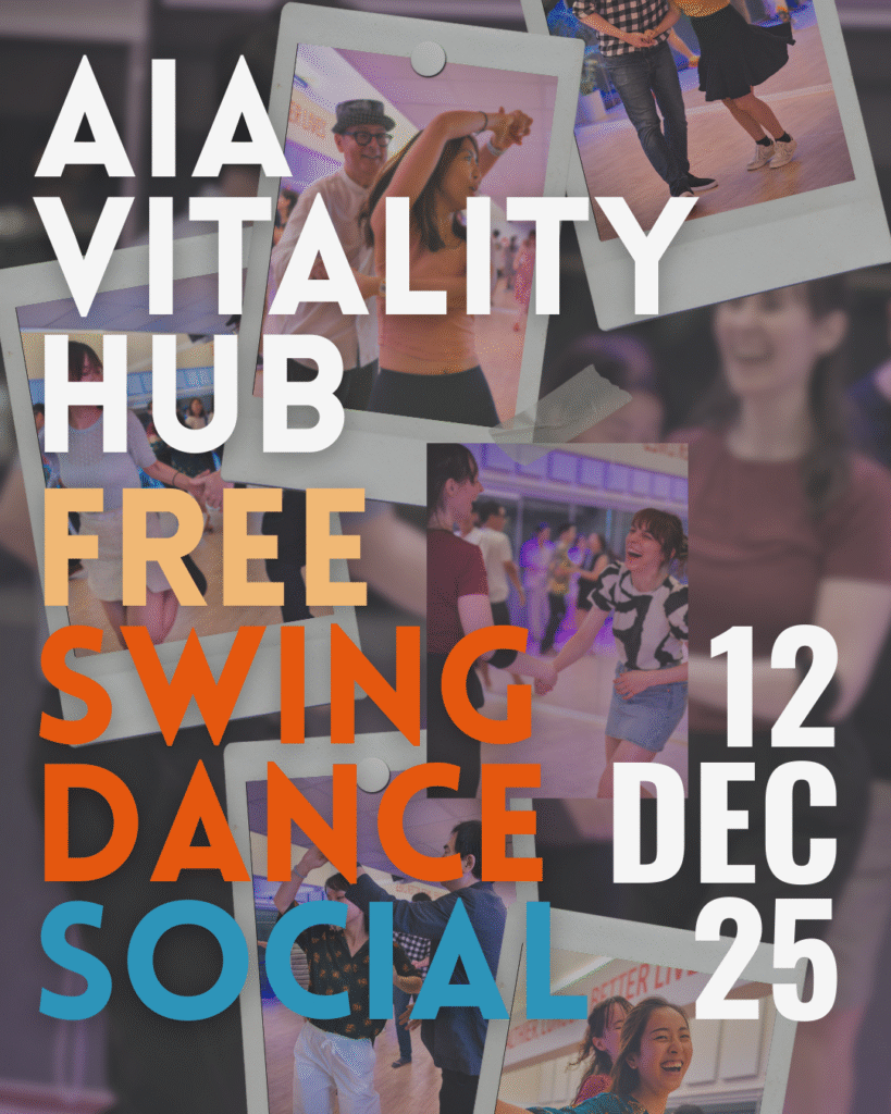 AIA Vitality Hub 本月將在海港附近的地點舉辦搖擺舞社交活動。我們很幸運能提供這個空間,鋪有空調木地板。當我們開始週末跳舞時,我們將播放一些搖擺曲子供您跳舞。免費入場,但請在此處註冊,因為空間有限且需求量很大。